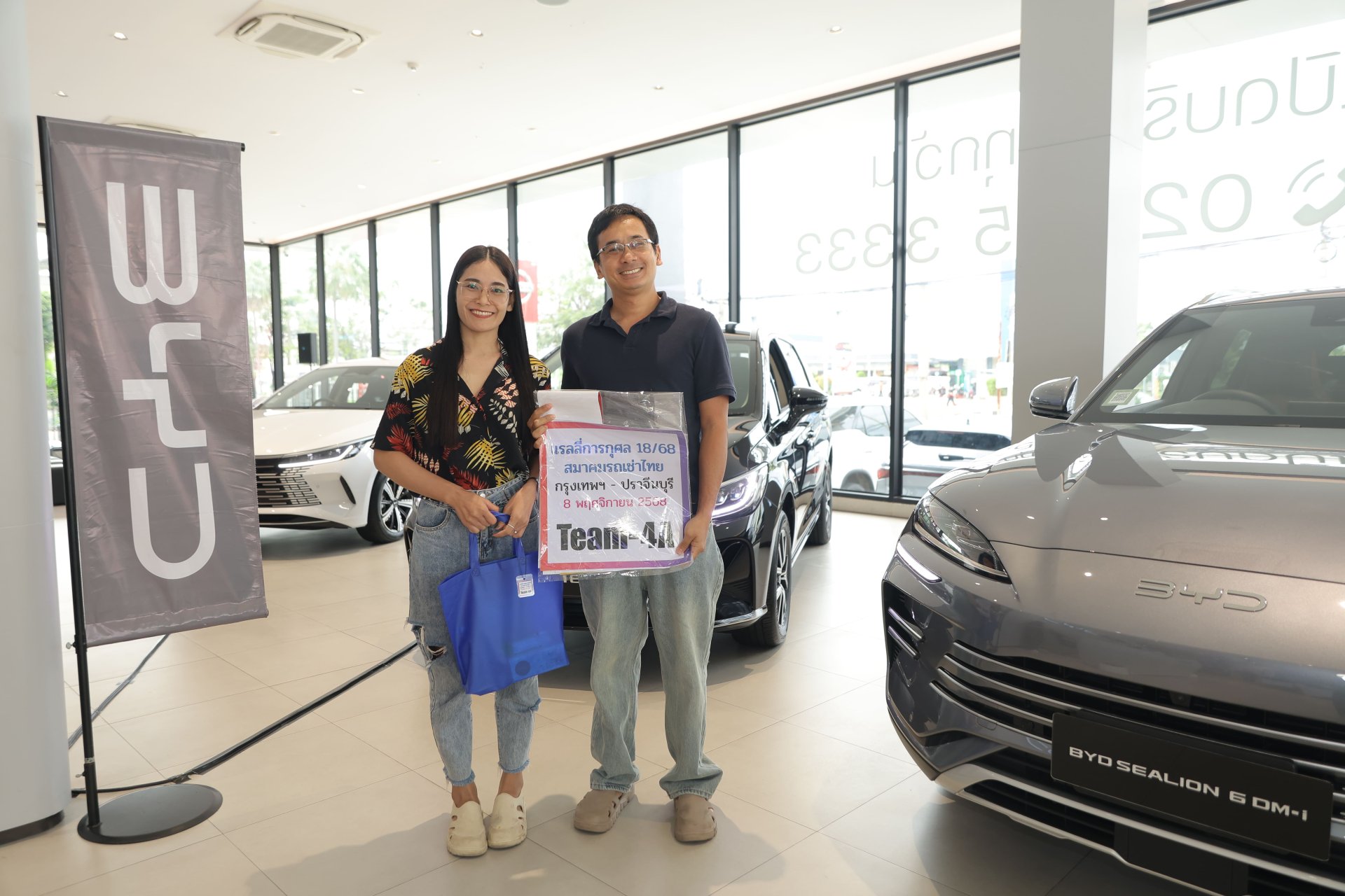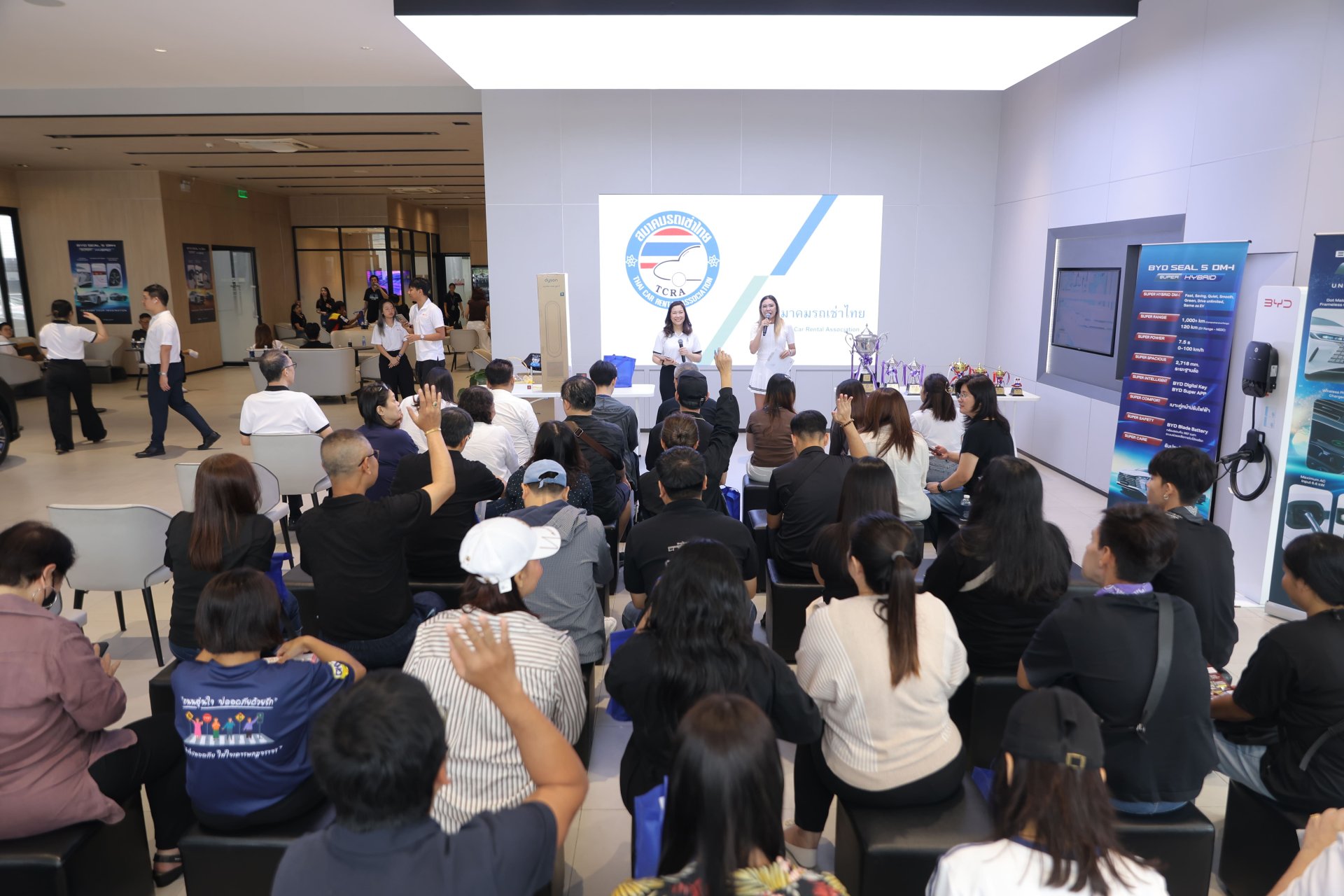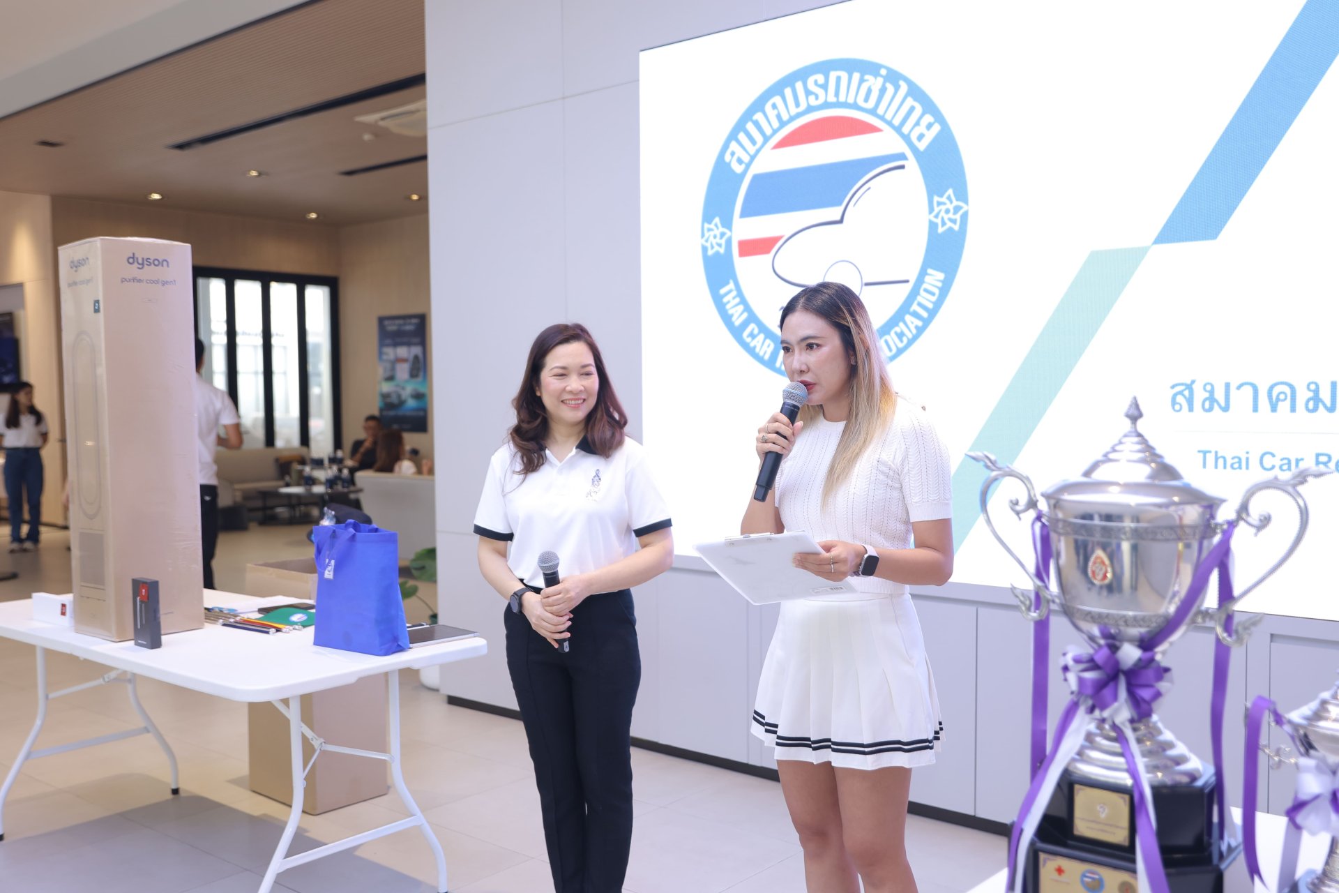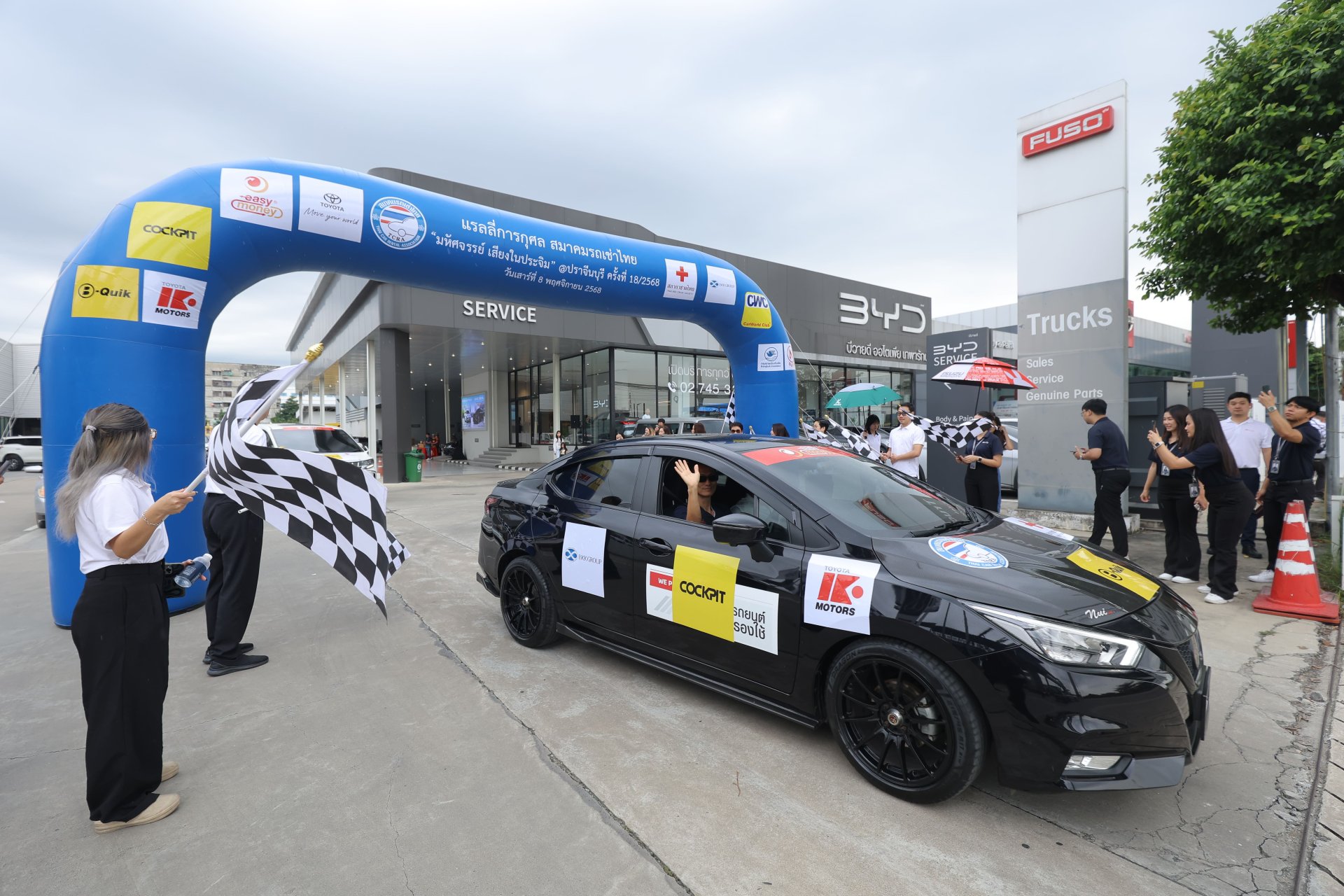 ผู้แทนจากสภากาชาดไทย ร่วมกันตีธงปล่อยรถเปิดการแข่งขัน ณ โชว์รูม BYD Autopia เทพารักษ์ พร้อมทั้งสมาชิกอย่างพร้อมเพรียงและสนุกสนาน