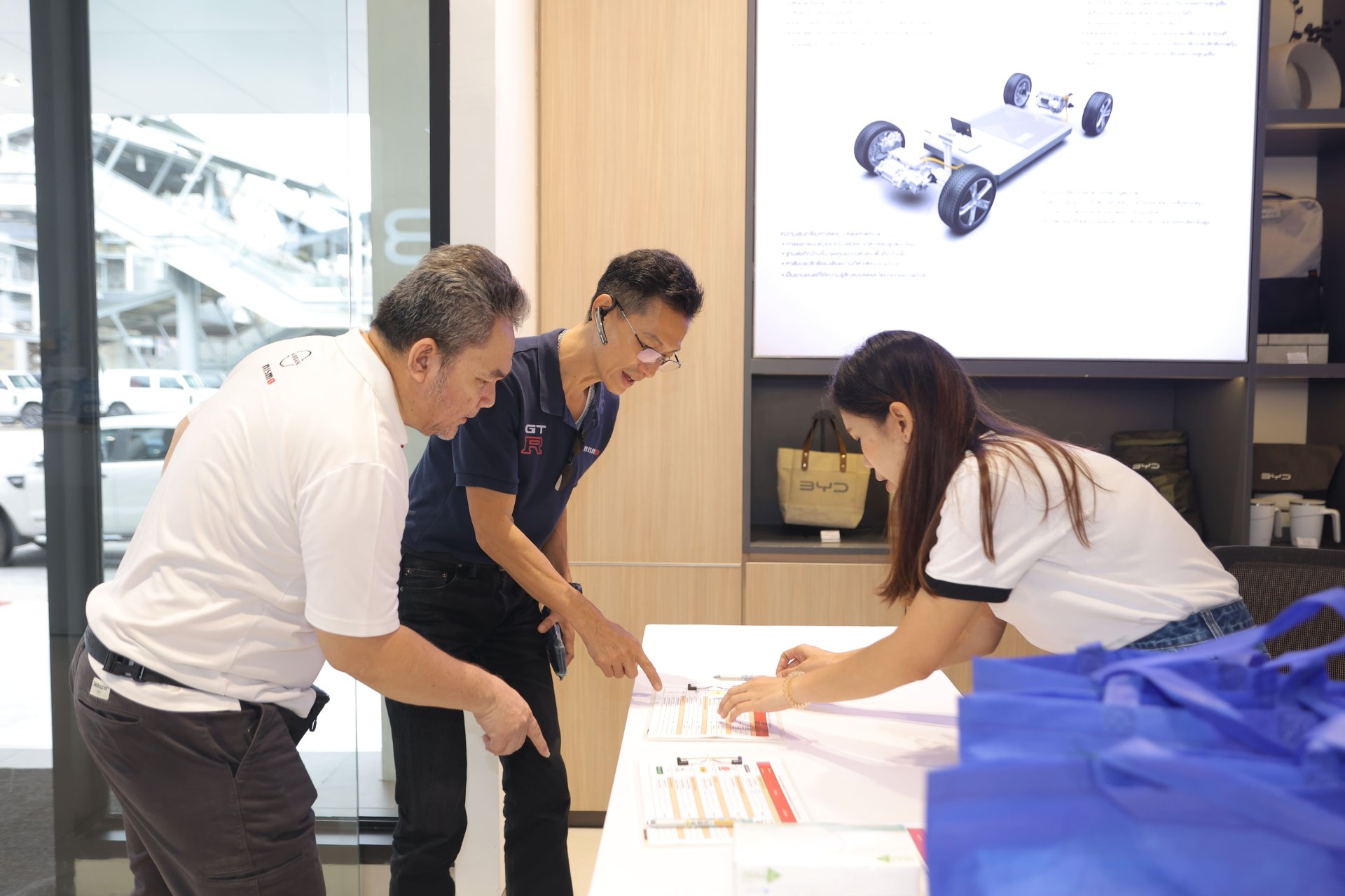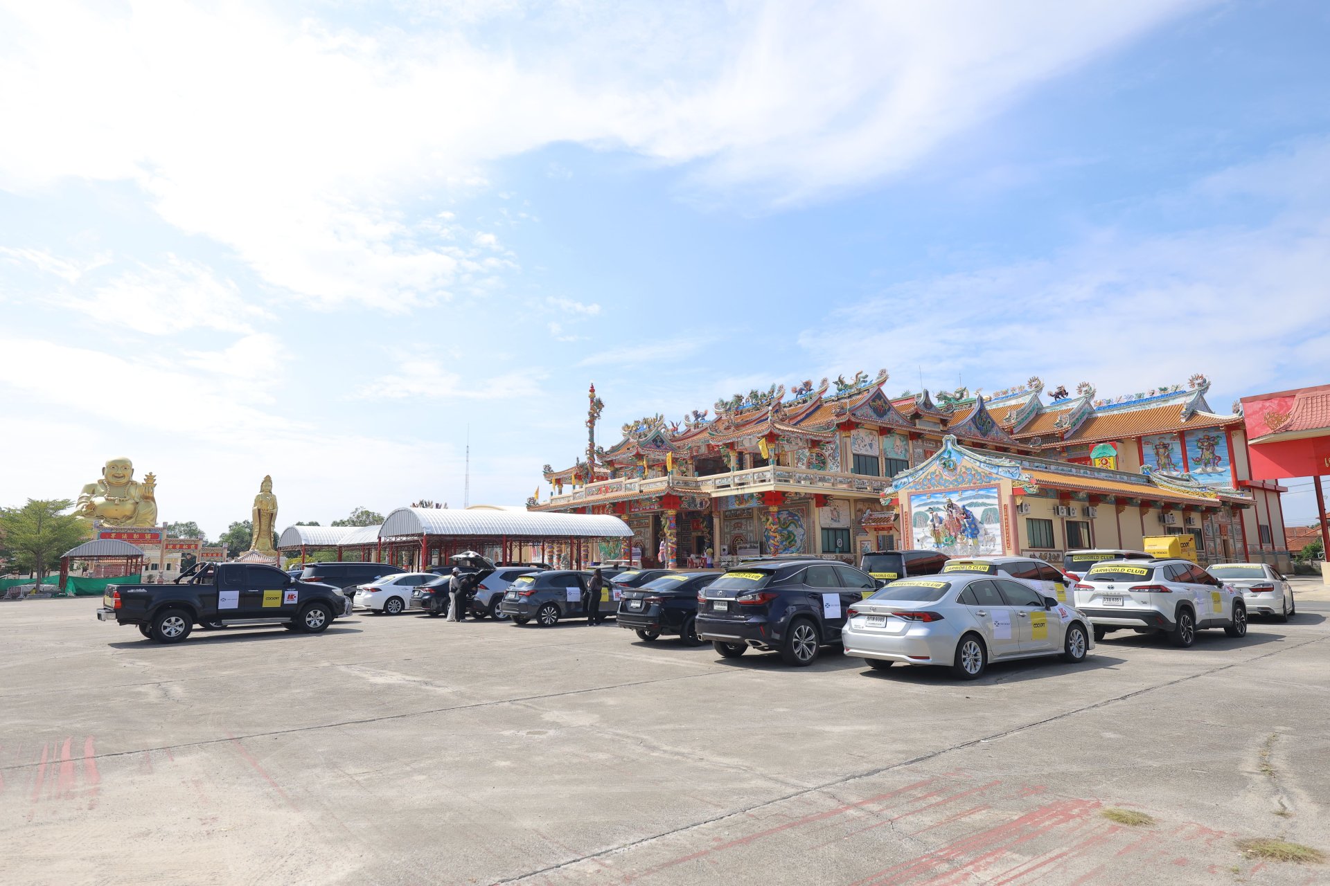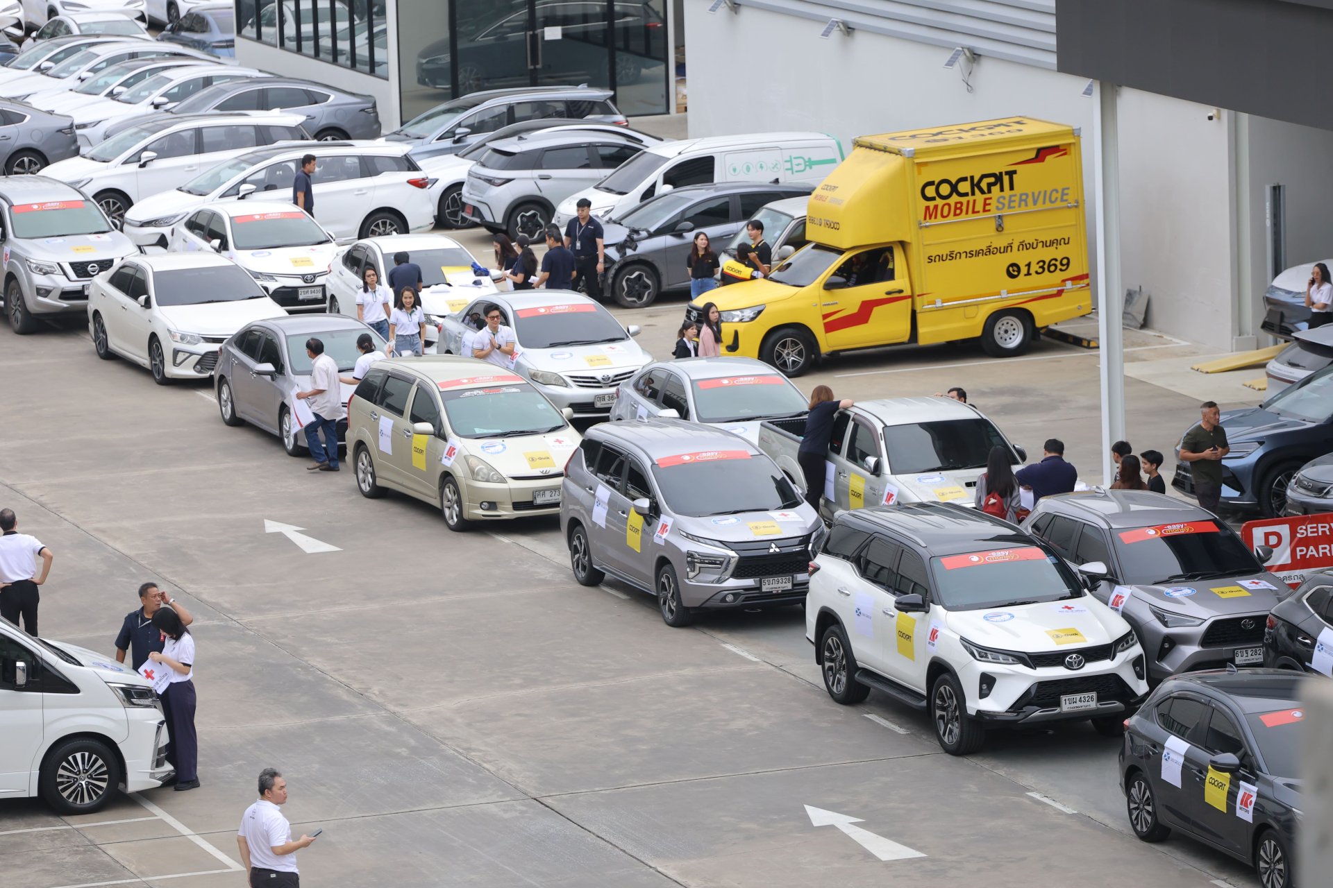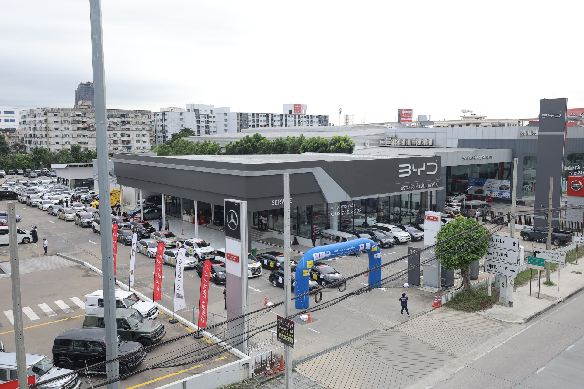 ผู้แทนจากสภากาชาดไทย ร่วมกันตีธงปล่อยรถเปิดการแข่งขัน ณ โชว์รูม BYD Autopia เทพารักษ์ พร้อมทั้งสมาชิกอย่างพร้อมเพรียงและสนุกสนาน